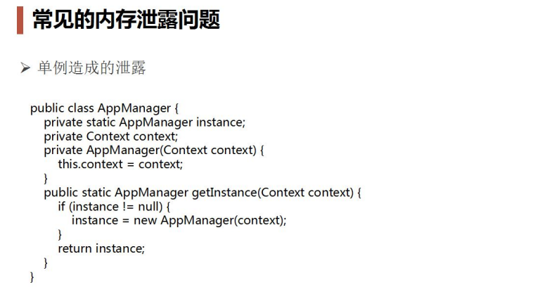 这里我们要注意单例模式产生的内存泄露比较容易被忽视,这点需要注意。再分享一个链接:http://blog.csdn.net/u013491687/article/details/51277361